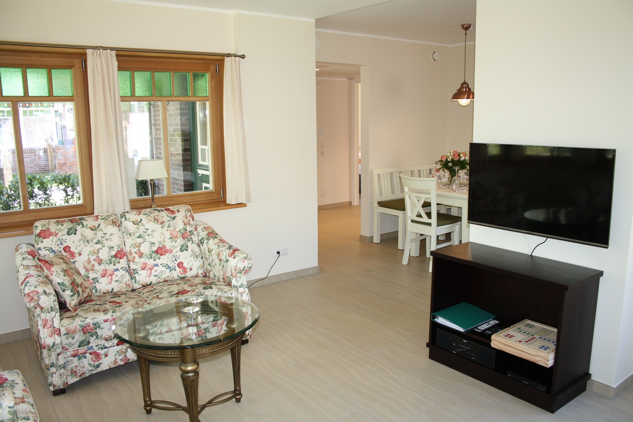 Die Wohnung "Deel" mit 65 qm liegt im Ergeschoss und verfügt über zwei Schlafzimmer mit Doppelbetten, Wohnzimmer mit angeschlossener Küche und Essbereich sowie einem Badezimmer mit Dusche und WC. Eine Terrasse ist über das Wohnzimmer zu erreichen. Die Wohnung ist vorgesehen für 4 Personen.