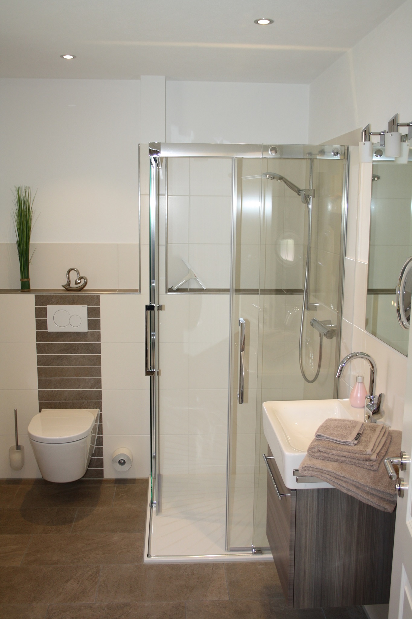 Bad mit Dusche und WC. Eine Terrasse ist über den Wohnbereich zu